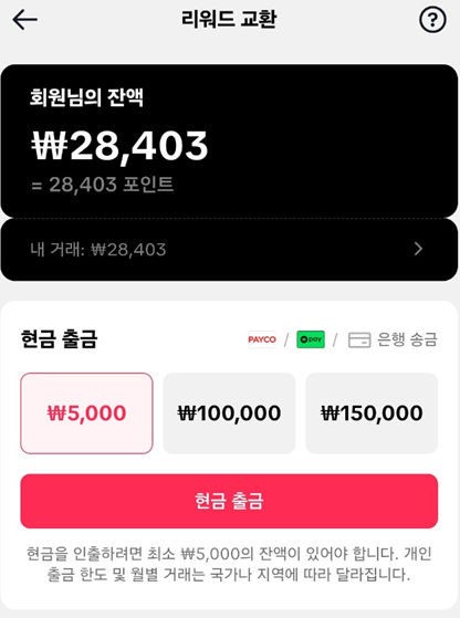 현금은 5,000원부터 출금이 가능합니다.