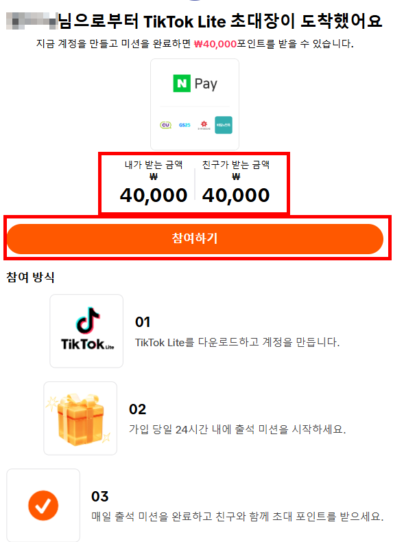 3. 초대장 보내기 아래 사진처럼 초대장 보내서 가입하고 출석 체크 하면 나도 친구도 4만 원이 바로바로.