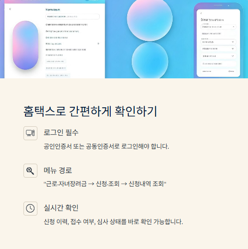 홈택스 로그인 후 "근로·자녀장려금 → 신청·조회 → 신청내역 조회" 메뉴를 선택하면 자신의 신청 이력, 접수 여부, 심사 상태 등을 실시간으로 확인할 수 있습니다.