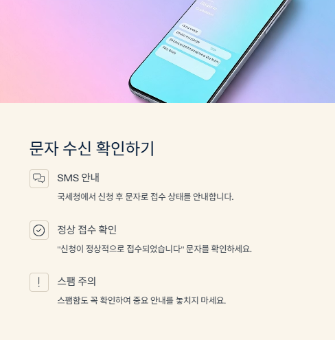 | 접수 확인 | 신청 직후 | 홈택스, ARS |