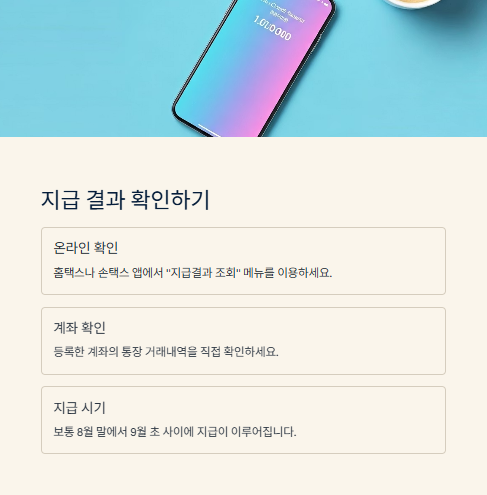 지급이 완료되면, 홈택스나 손택스 앱에서 "지급결과 조회" 메뉴를 통해 입금 여부와 금액을 확인할 수 있습니다. 또한, 등록한 계좌에 직접 입금되므로 통장 거래내역 확인도 필수입니다. 보통 8월 말에서 9월 초 사이에 지급이 이뤄집니다.