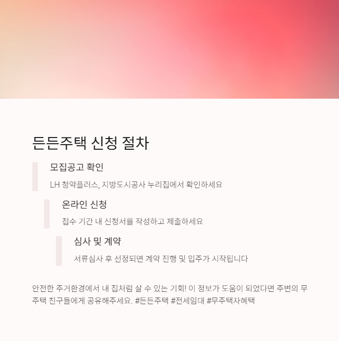 이번 포스팅에서는 든든주택의 신청 자격, 신청 방법, 입주 절차, 그리고 우선순위 조건까지 한눈에 파악할 수 있도록 깔끔하게 정리해 드립니다.