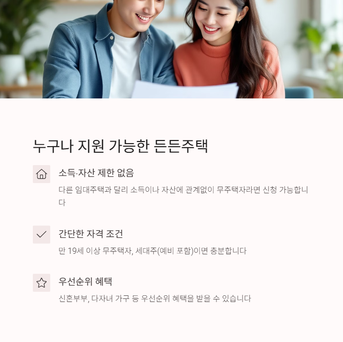 든든주택은 기존 전세임대주택과 달리 소득·자산 기준이 없습니다.