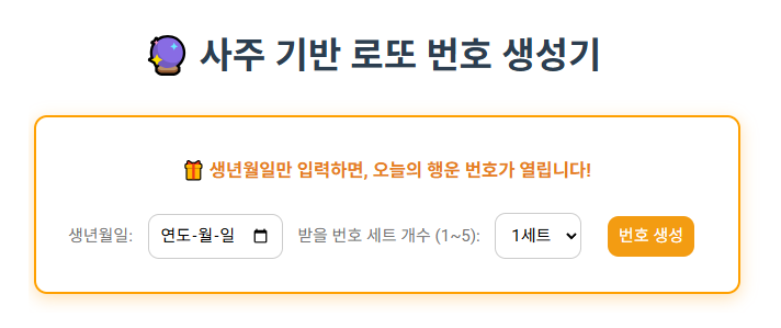아래는 실제로 사용 가능한 무료 사주 기반 로또 번호 생성기입니다. 사용자는 단지 자신의 생년월일만 입력하면, 자동으로 추천 번호가 생성됩니다.